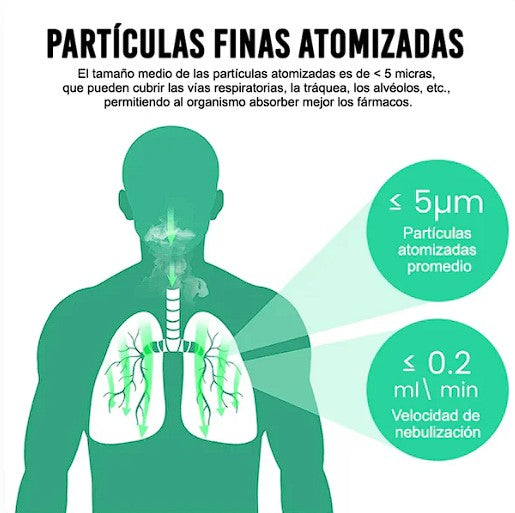 Gracias a su sistema de microvibración, el medicamento se transforma en una niebla fina que llega directamente a tus pulmones. Sin ruido. Sin molestias. Sin cables.